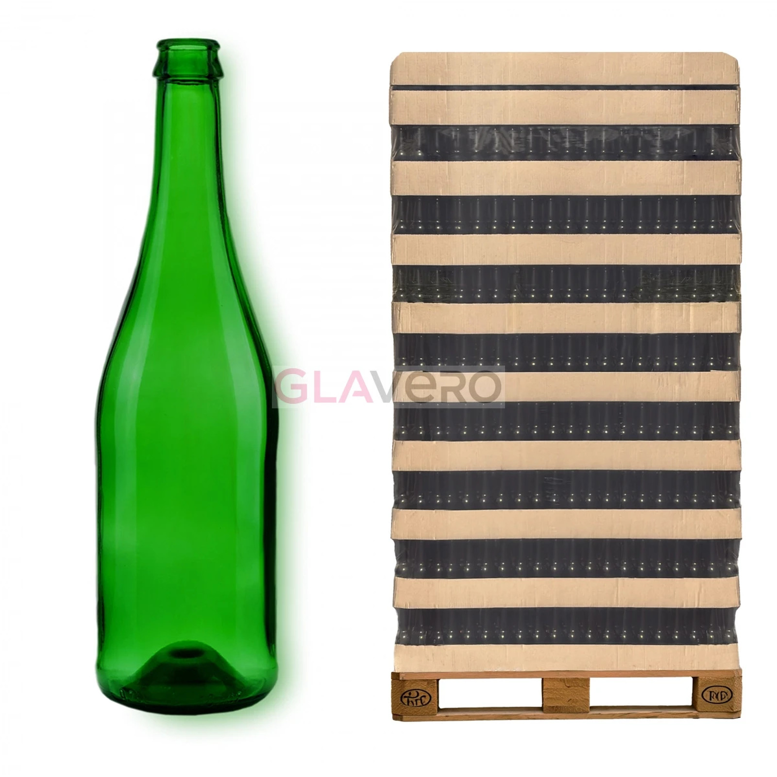 Klassische 750 ml grüne Glasflasche für Champagner, Sekt und Cider. Das RSZ Dorato Modell ist druckbeständig und hochwertig. Großhandel: sales@glavero.eu.